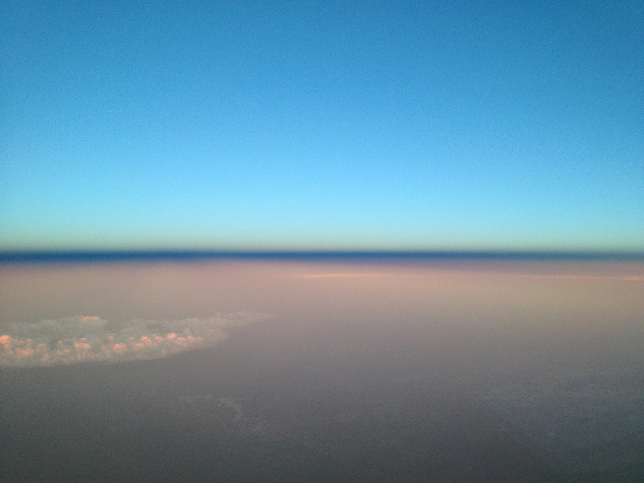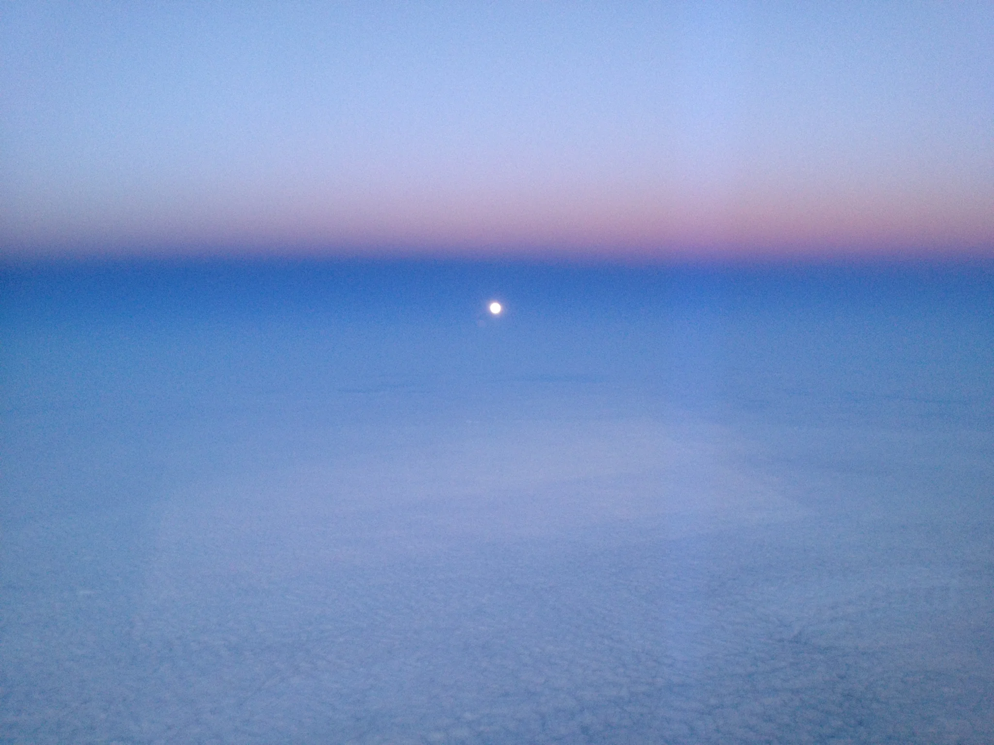 It’s difficult to get a really good photo of The Terminator through an inch of laminated glass, here a full moon is just rising above the horizon as night approaches from the east.